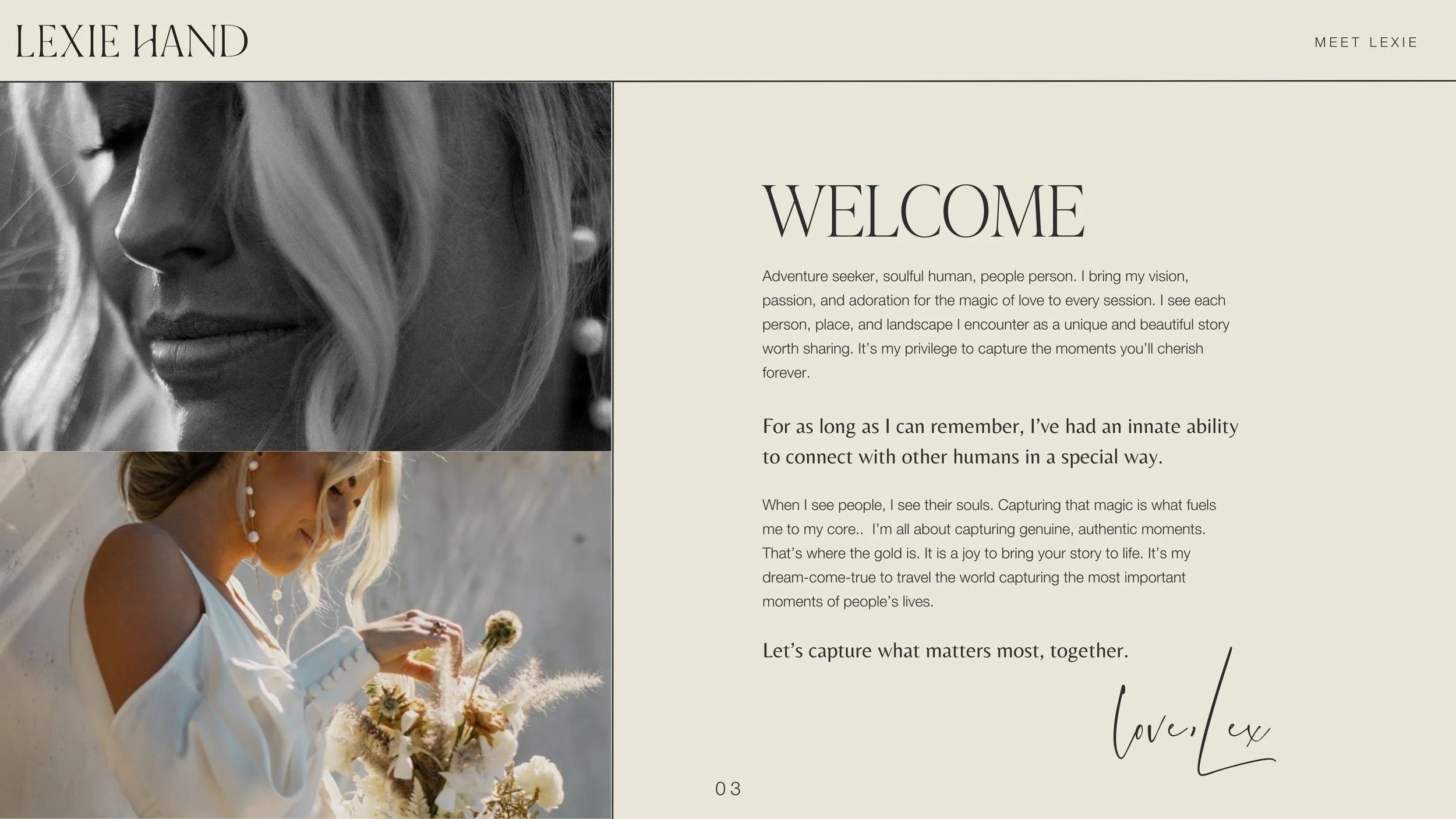Lexie Hand, a luxury wedding photographer, needed new copy for her pricing guide. I centered her artistry, devotion, and carefree spirit in my copywriting. I partnered with the talented graphic design team at Drop Cap Design to bring the pricing guide to life.